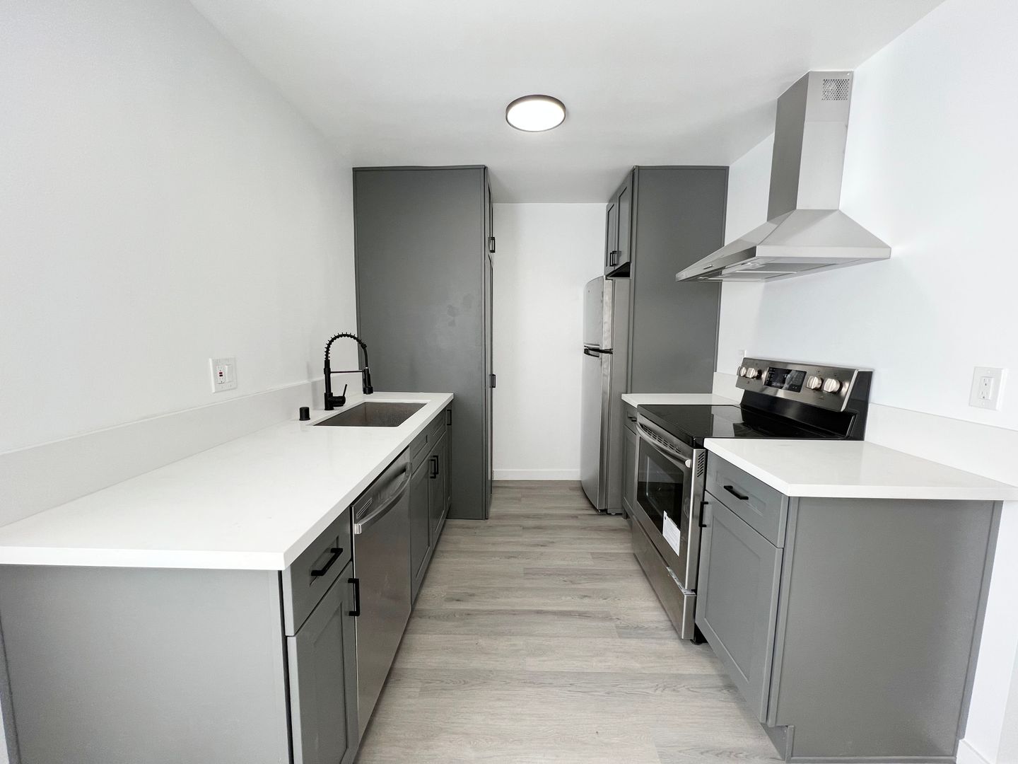 Modern kitchen with oven/range, refrigerator, and dishwasher