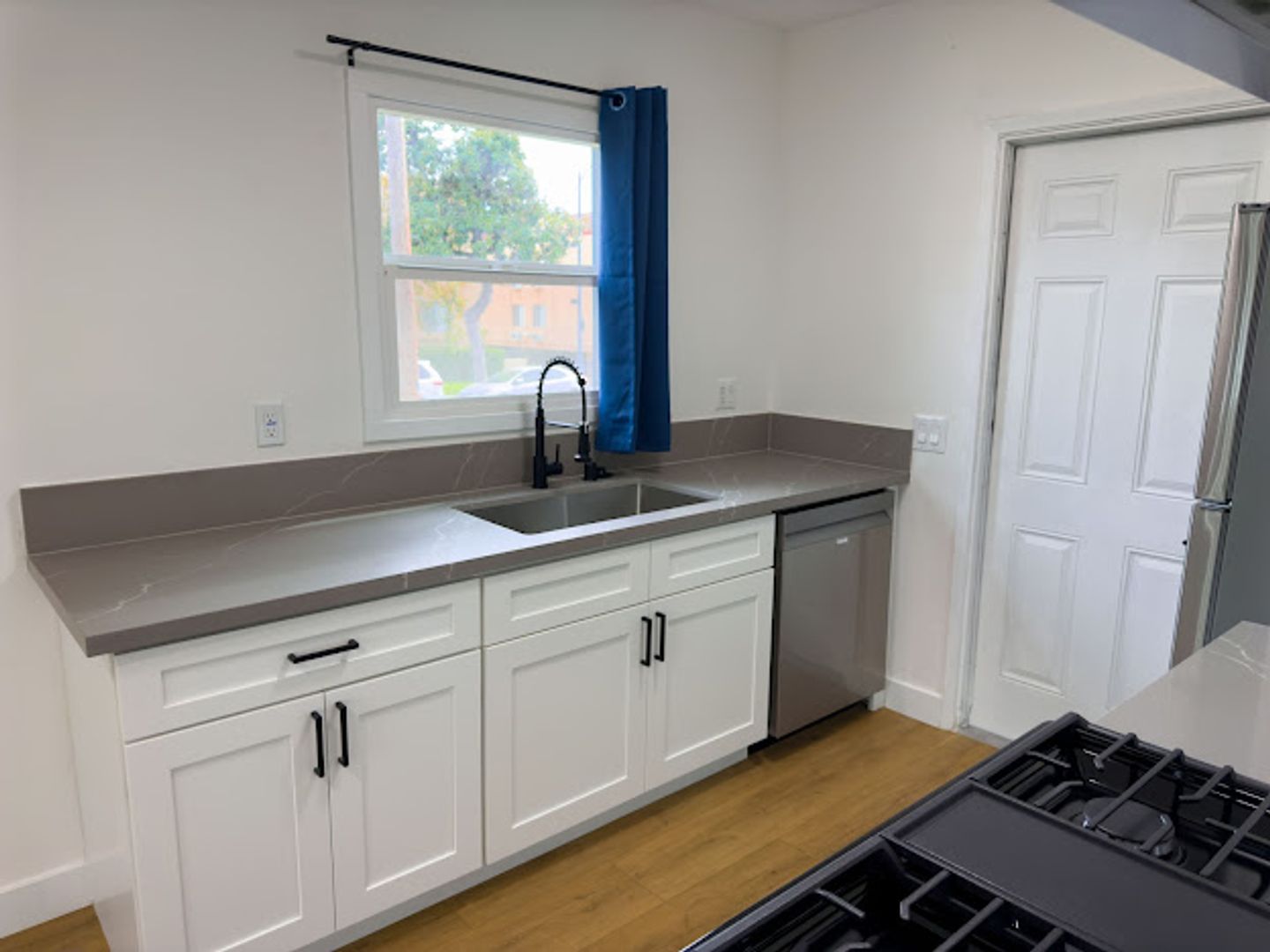 Modern kitchen with stainless steel appliances (gas range, refrigerator, dishwasher)